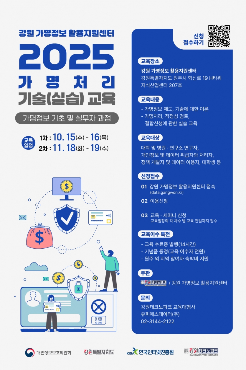 강원 가명정보 활용 지원센터에서 가명처리 등에 필요한 가명처리 실무 교육을 진행합니다.